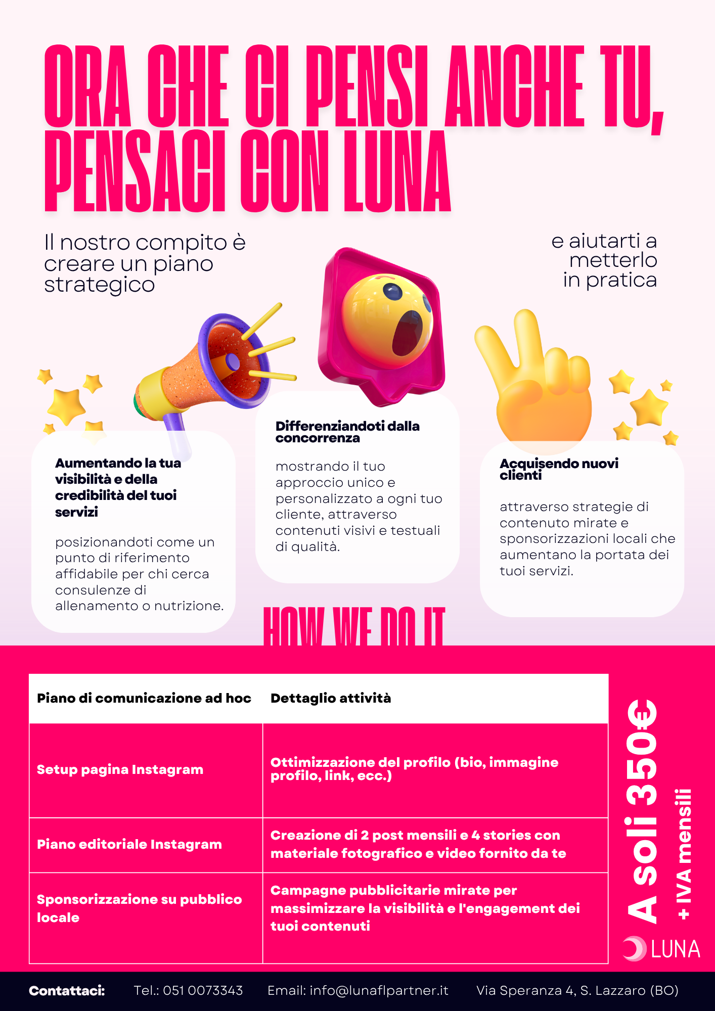 ©Copyright Luna SRL. All Rights ReservedLUNA SRL a socio unicoSede Legale: Via Alfredo Calzoni 1/3, 40128 Bologna (BO)Sede Operativa: Via Speranza 4, 40068San Lazzaro di Savena (BO)Email: info@lunaflpartner.itTelefono: +39 051 0073343P.IVA/CF: 03270801206REA BO-505555Capitale sociale versato € 9.000Privacy e cookie